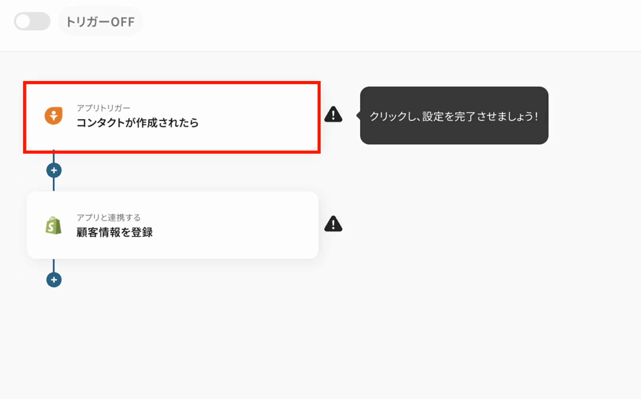 Freshsalesトリガー「コンタクトが作成されたら」の直下にある+マークをクリックし、有料プランで利用可能な「分岐」オペレーションを追加することで実現可能です。