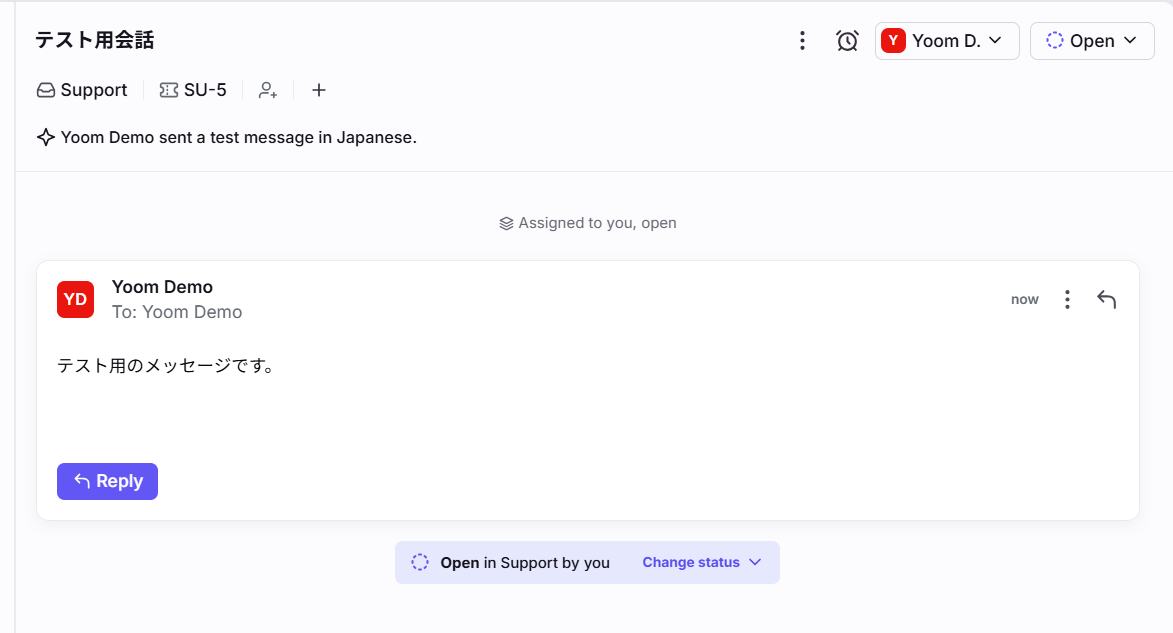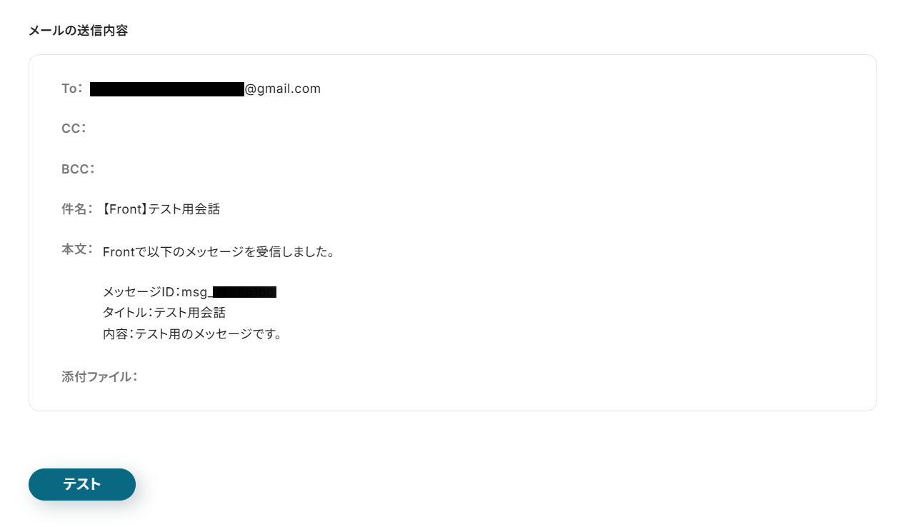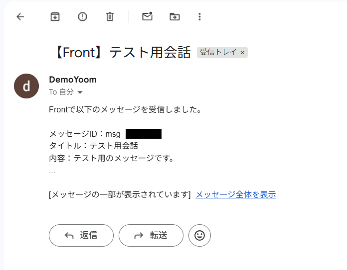 設定を終えたら、Frontの指定したConversationでテスト用のメッセージを送信してください。 ※ テスト用メッセージの例