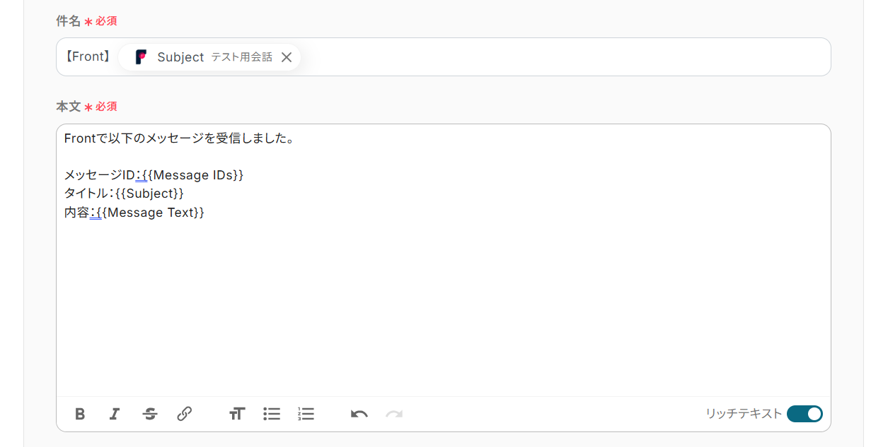 Outlookでメールを送信するアクションでは、通知先のメールアドレスを任意で設定することが可能です 通知メールの本文には、固定のテキストだけでなく、Frontで受信したメッセージの件名や送信者情報などを変数として埋め込むこともできます ■注意事項