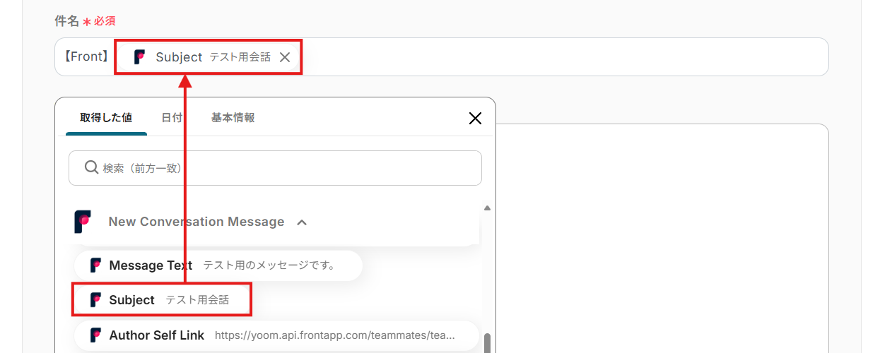 動的な値と固定テキストを組み合わせて、「件名」と「本文」を設定しましょう。 入力欄クリック時に表示されるトリガーアクションメニューから、取得したメッセージ情報を選択可能です。 項目をクリックすると、入力欄に{{項目名 取得した値}}という形で追加されます。※ この動的な値を使用せずに固定テキストだけで設定してしまうと、フローが稼働する度に同じメールが送信されてしまうためご注意ください。