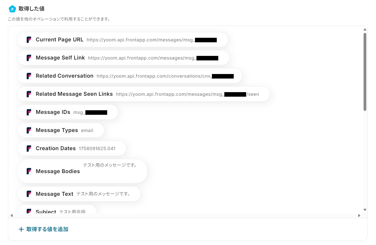 テストに成功すると、「取得した値」に最新メッセージの情報が追加されます。 これらの値は、以降のアクションで動的な値(フローが稼働する度に更新される値 )として使用可能です。 詳しい説明は、こちらのヘルプページ をご覧ください。