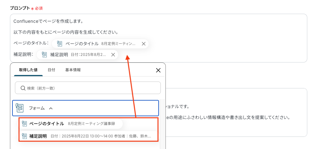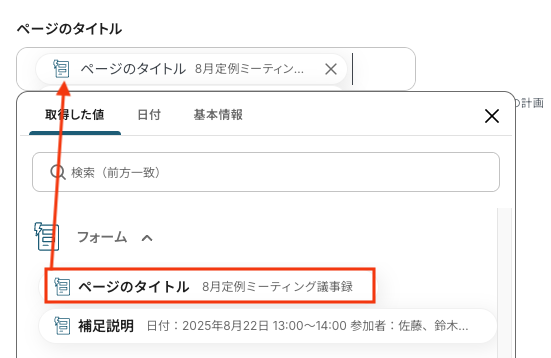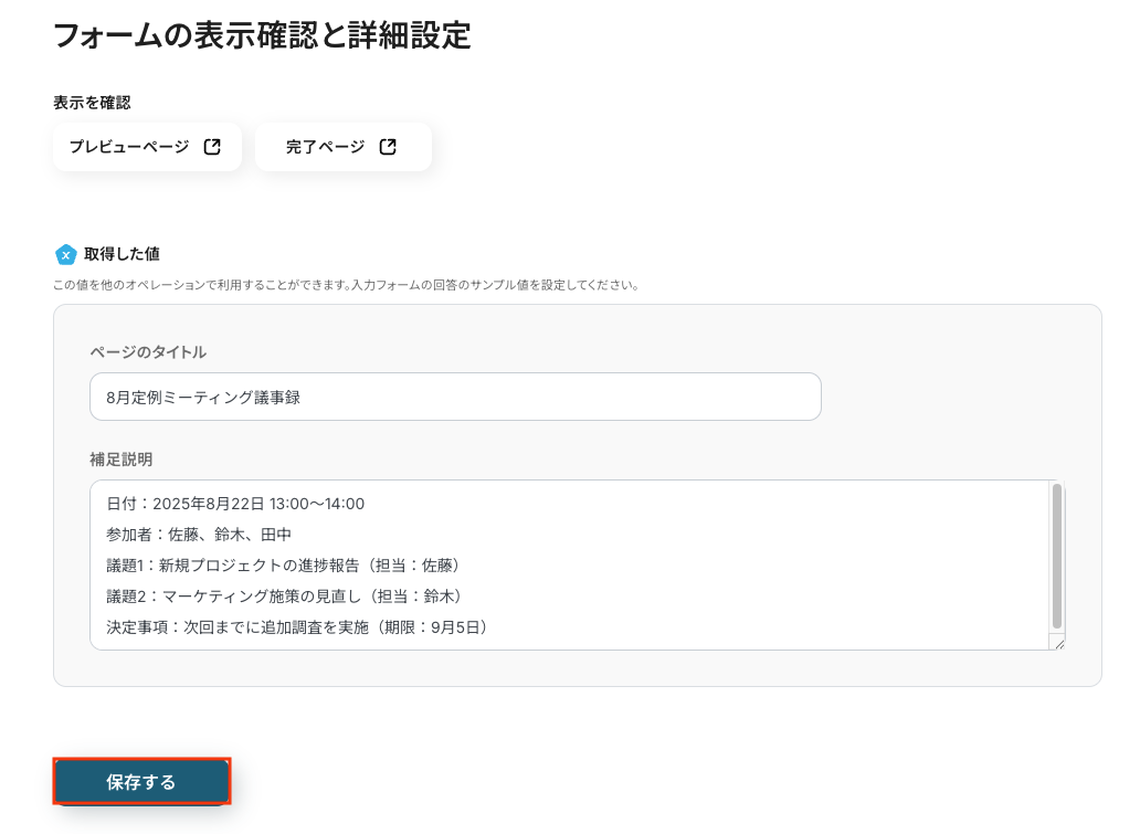 今回は議事録を例にして、「ページのタイトル」と「補足説明」に画像の通りサンプルの回答を入れています。