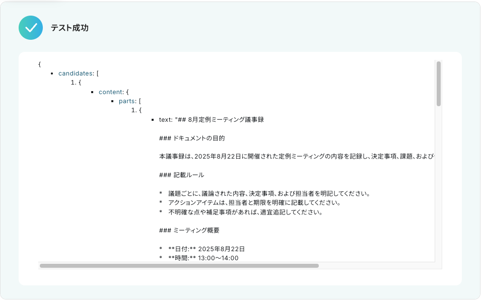 テストが成功すると、Geminiによって生成されたコンテンツの情報が一覧で表示されます。