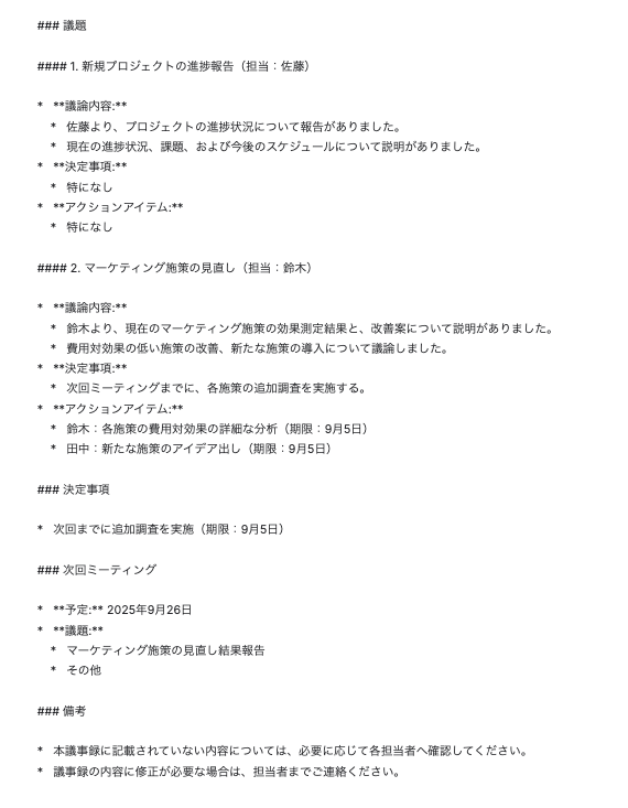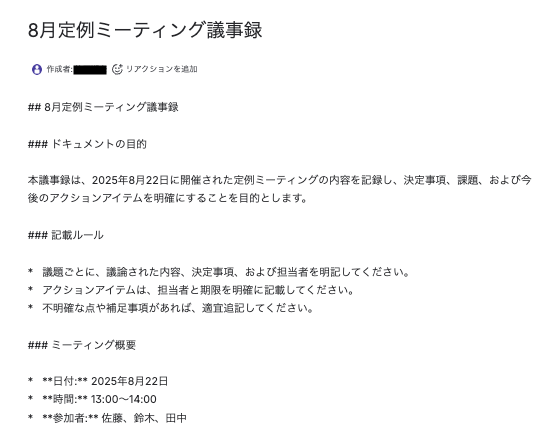 この連携は、議事録のたたき台やレポート、社内wikiの記事などをゼロから作成する手間を省き、コンテンツ作成の初動をスピードアップさせることが可能です。