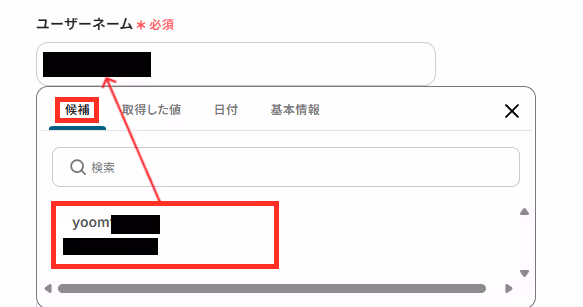 「ユーザーネーム」は、フィールドをクリックし候補から選択してください。