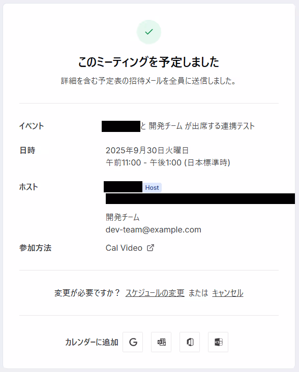 また、テストに成功するとCal.comに予定が登録されているので、確認してみましょう。