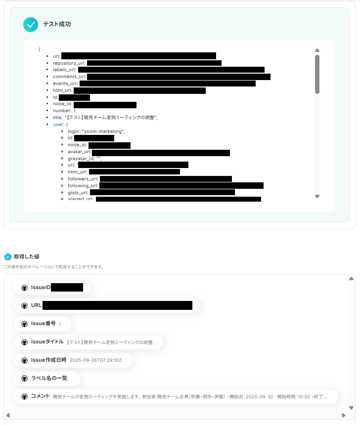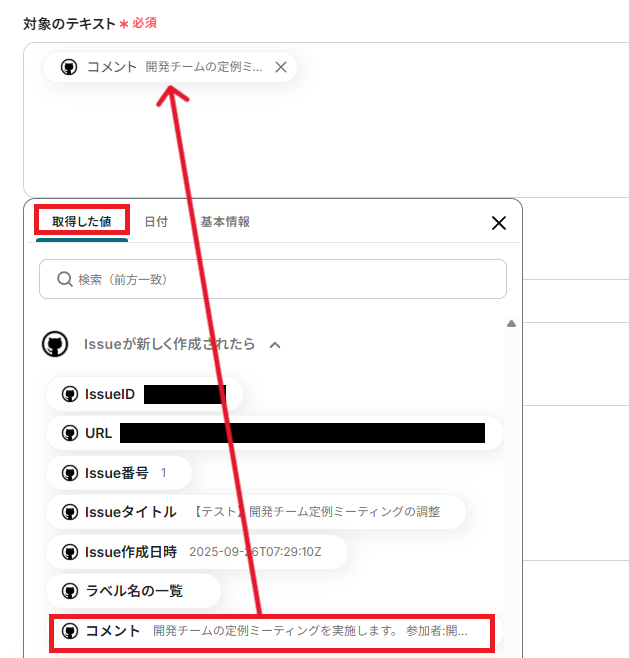 「対象のテキスト」は、取得した値からコメントを選択しましょう。