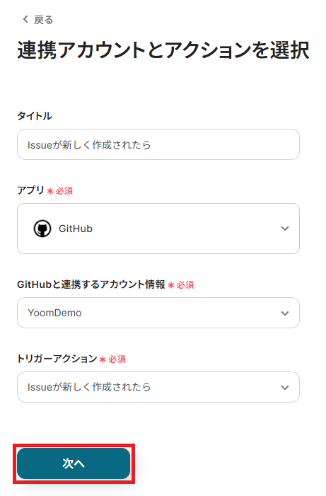 まず、「Issueが新しく作成されたら」をクリックしてください。