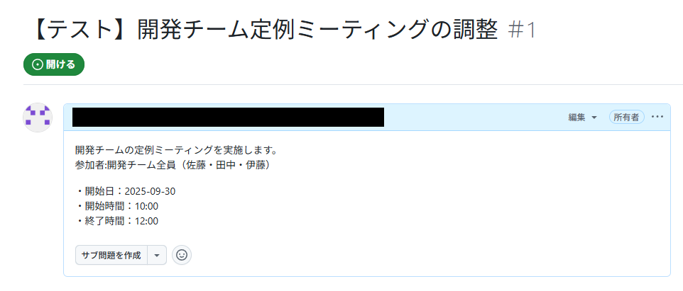 作成するIssueは、架空の情報(「テスト会議」や「テストミーティング」など)でOKです。