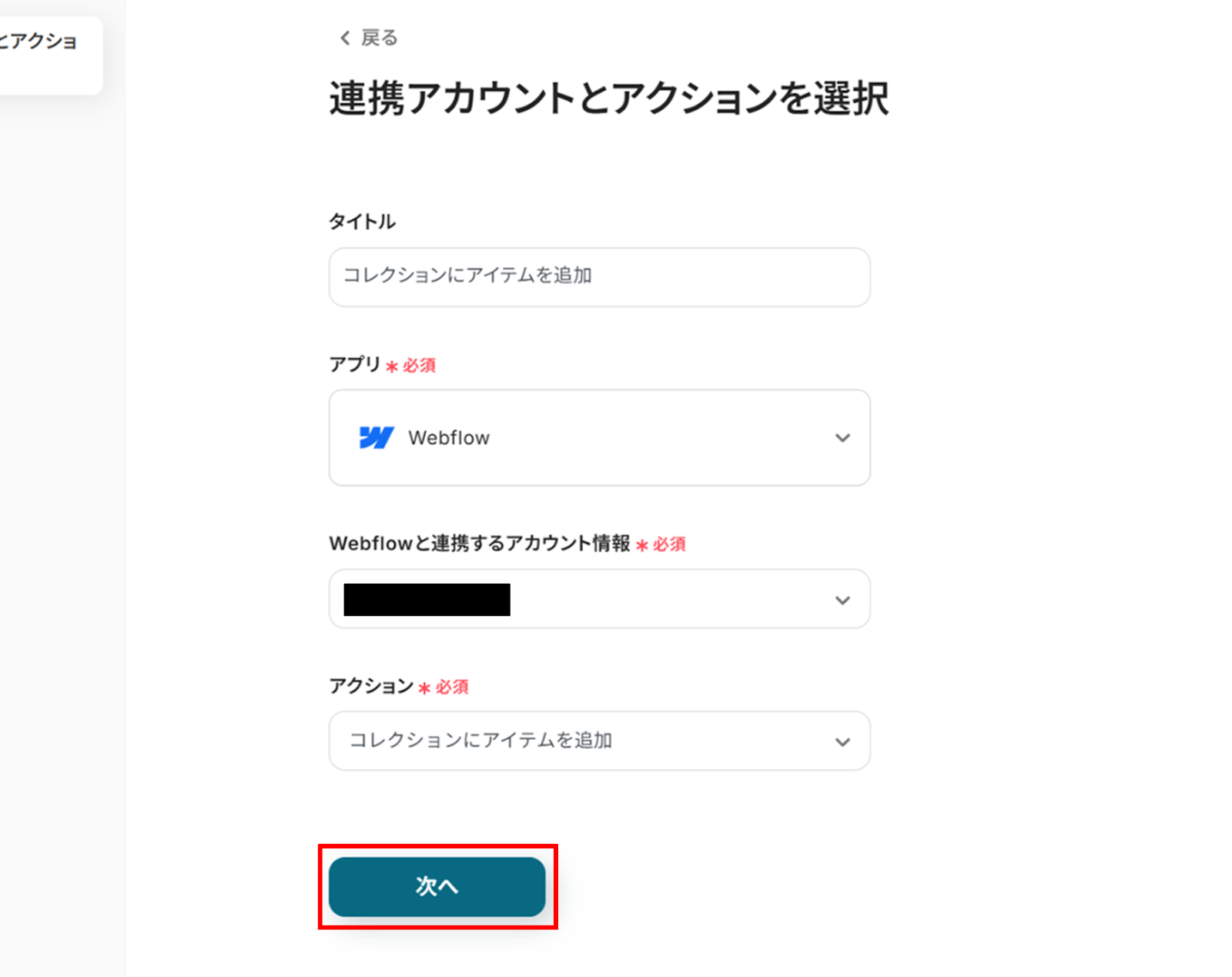 (2)「連携アカウントとアクションを選択」画面から、Webflowと連携するアカウント情報に誤りがないかを確認し、アクションは「コレクションにアイテムを追加」のままで「次へ」をクリックします。
