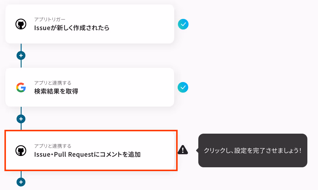 GitHubで特定のラベルが付いたIssueや、特定の内容を含むIssueが作成された場合にのみ、自動でGoogle 検索を実行し、検索結果をコメントに追加する連携です。