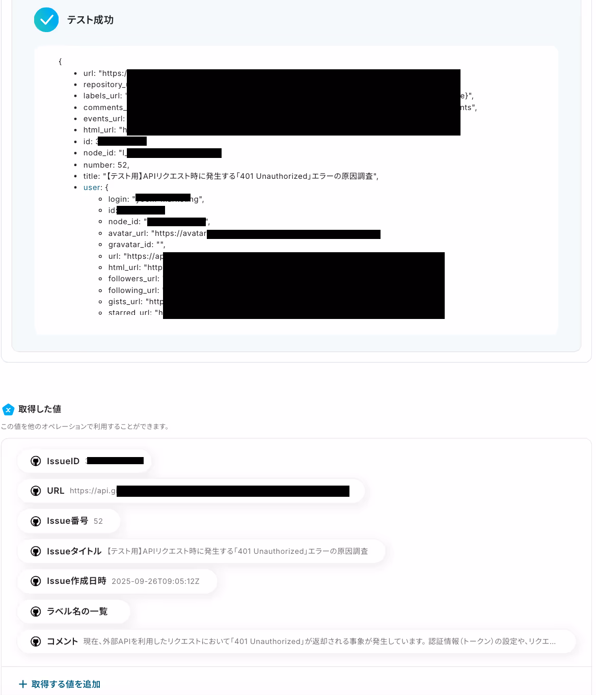 入力を終えたら「テスト」を実行し、取得した値を確認します。