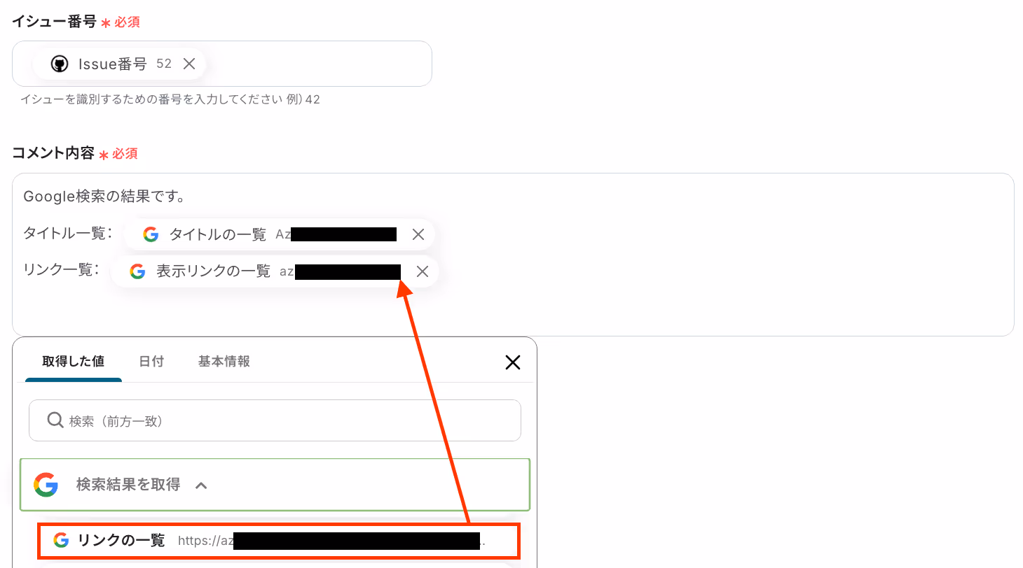 ここでは、先ほどGitHubの設定で取得したデータをGoogle 検索で検索結果を取得する設定を行います。