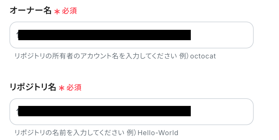 次に「オーナー名」「リポジトリ名」を入力します。