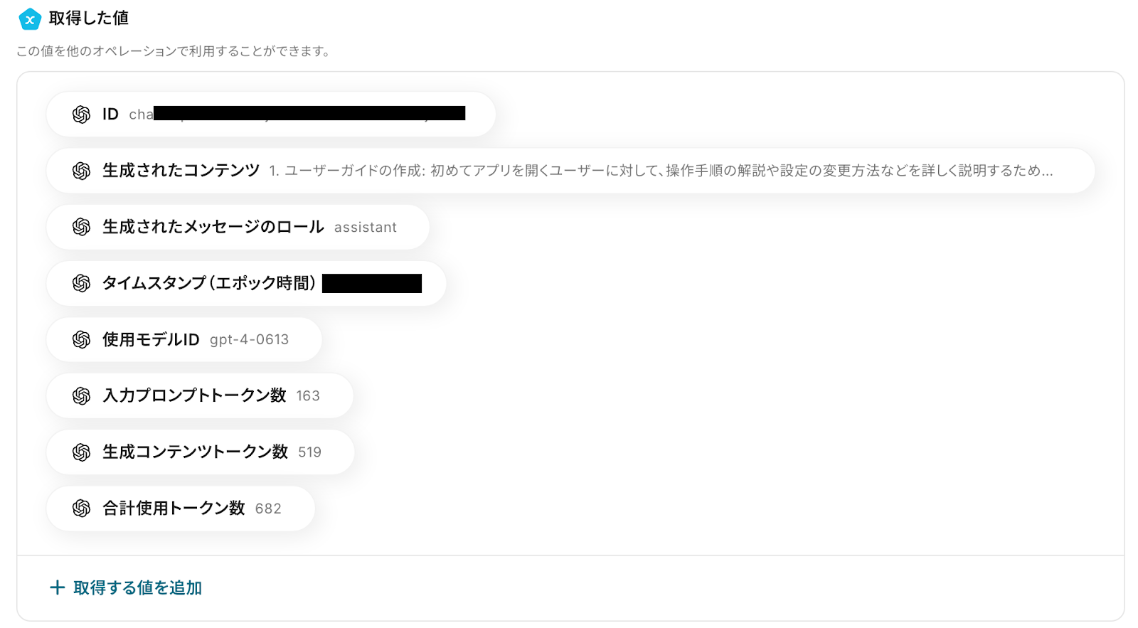 テストに成功したら、取得した値(アウトプット)を確認してください。