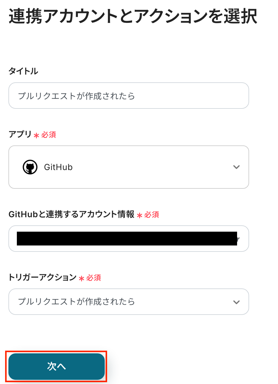 - 次に、トリガーでGitHubを選択し、「プルリクエストが作成されたら」というアクションを設定します。