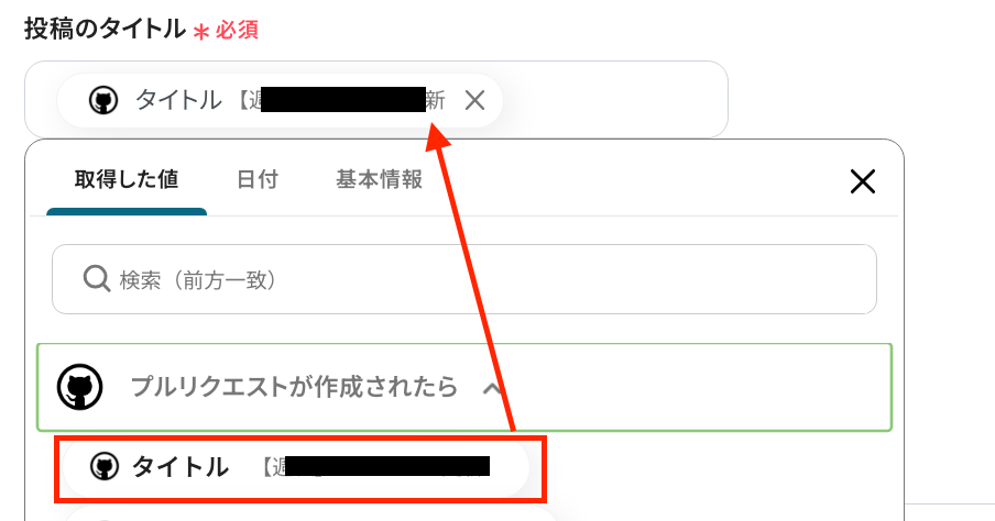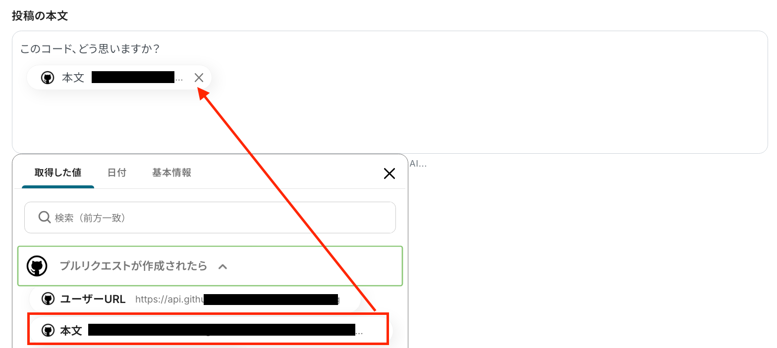 - 投稿のタイトルや本文には、固定のテキストだけでなく、トリガーとなったGitHubのプルリクエスト情報(タイトル、URLなど)を変数として埋め込み、投稿内容を自由にカスタマイズできます。
