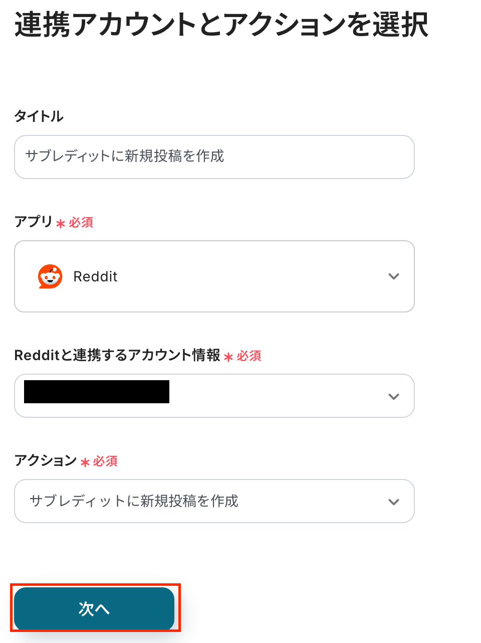 - Redditへ新規投稿を作成するアクションでは、投稿先のサブレディットを任意で指定できます。