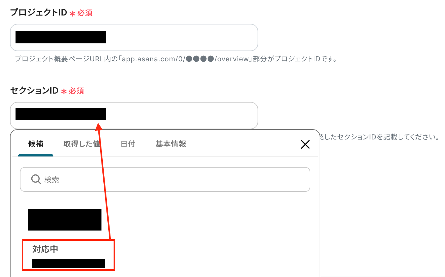 「プロジェクトID」 :入力欄をクリックして表示される候補から選択してください。