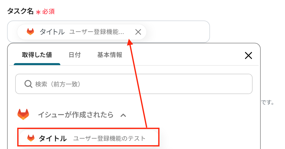 「タスク名」 :入力欄をクリックして表示される『取得した値』を引用して設定してください。