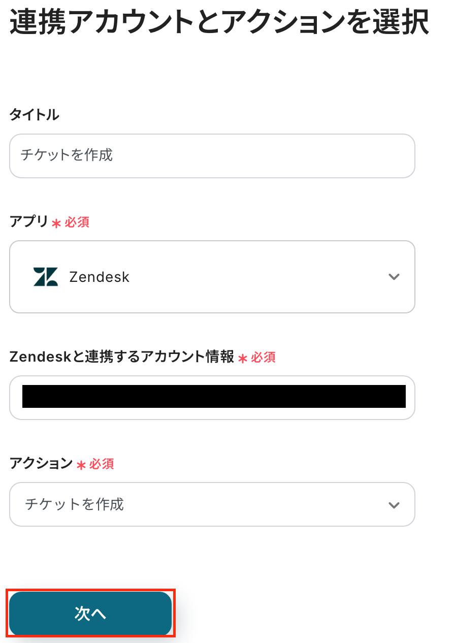 最後の設定です。ここでは、Zendeskにチケットを作成する設定を行います。