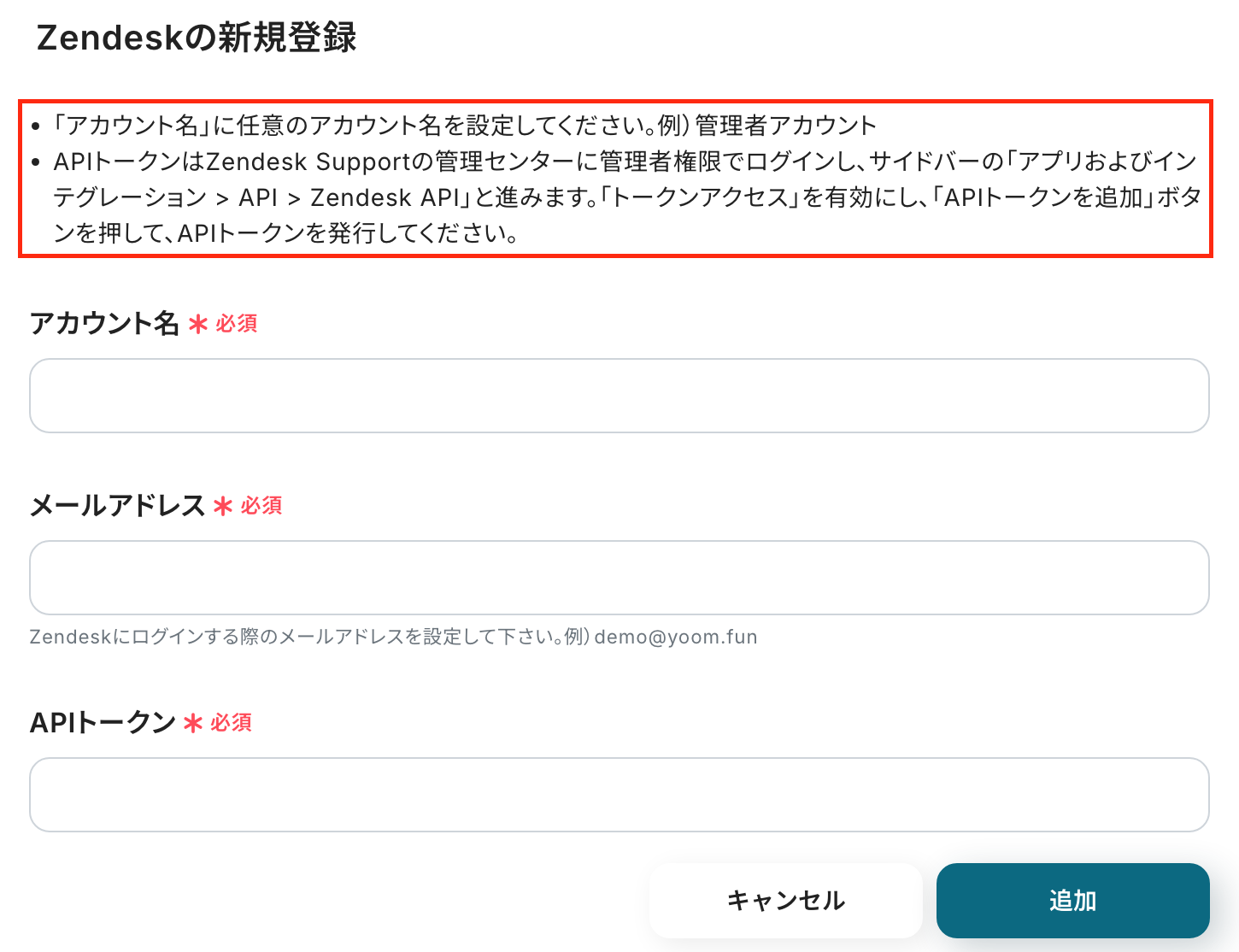 「Zendeskの新規登録」画面から、赤枠を確認の上、アカウント名、メールアドレス、APIトークンを入力し、「追加」をクリックします。