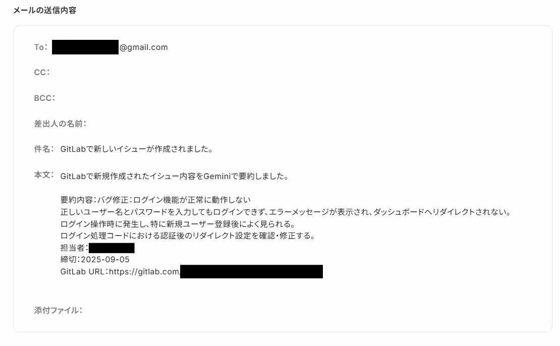 GitLabで新しいイシューが作成されるたび、その内容をGeminiが自動的に要約し、指定した宛先にメールで通知する連携です。