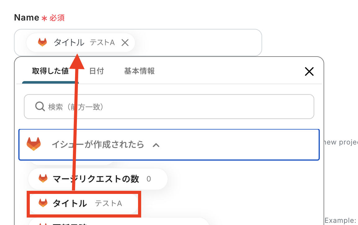 Nameにてタスクの名称を設定します。 先ほど取得した値から選択しましょう! 固定値を設定する場合は、直接入力してくださいね。