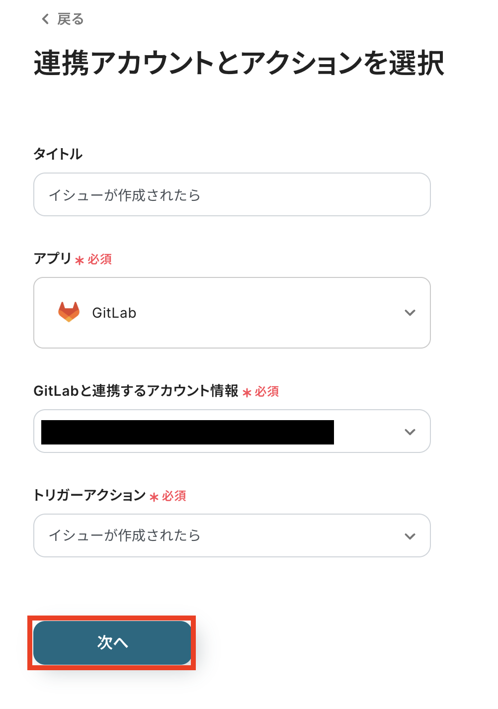連携アカウントとトリガーアクションを選択しましょう。 トリガーアクションは、テンプレート通りに「イシューが作成されたら」のままで大丈夫です。 「次へ」をクリックして進んでください。