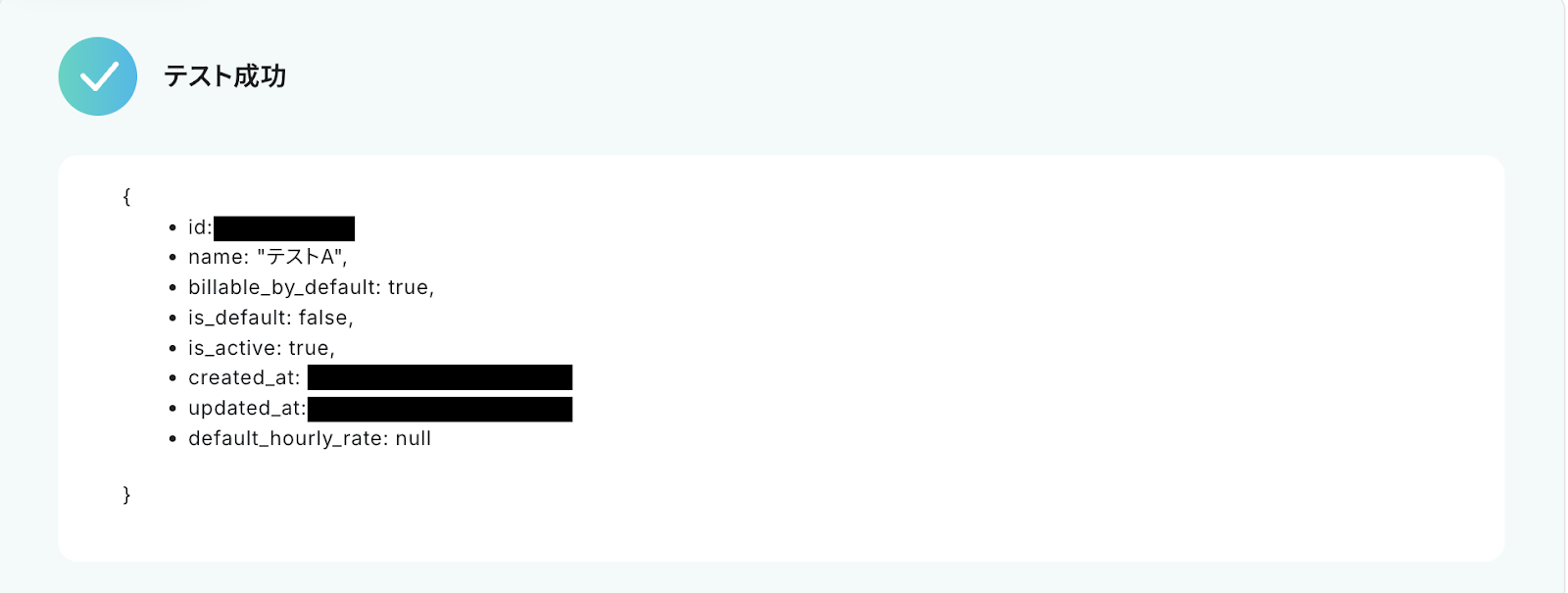 「テスト成功」と表示が出たら、アウトプット (取得した値)が取得されます。