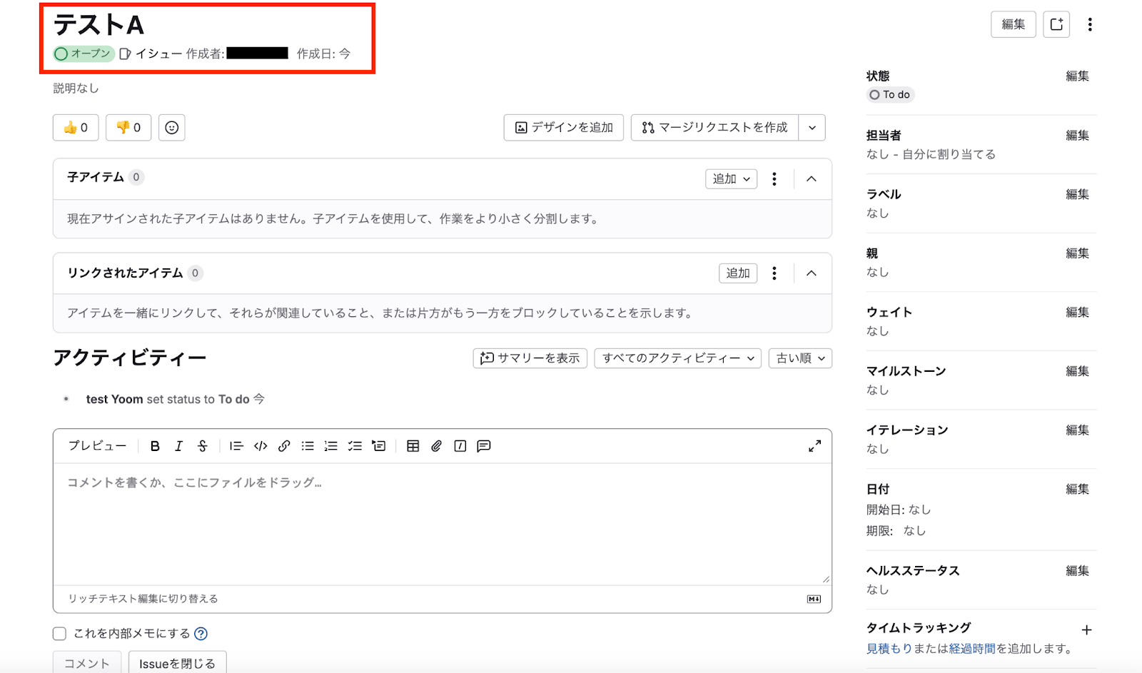 プロジェクトIDの設定ができたら、実際にGitLab上でイシューを作成しましょう。 今回は下記の「テストA」というイシューをテストとして使用します!