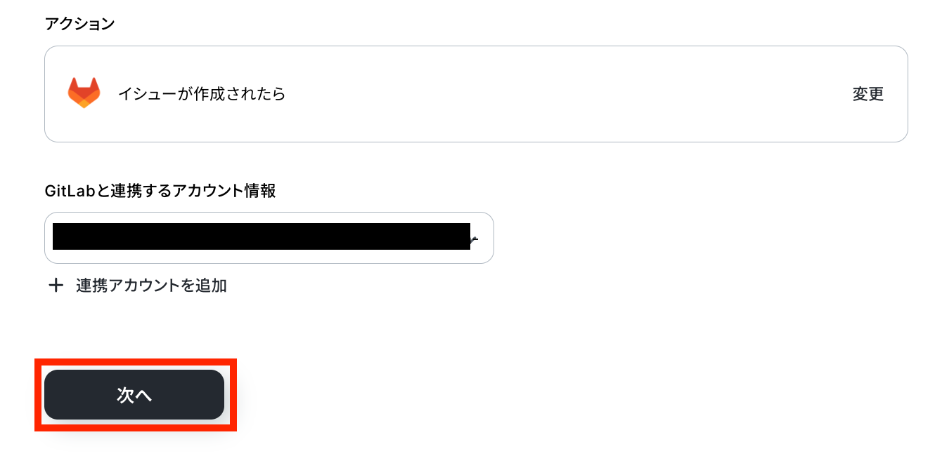 アカウントを確認して、アクションは「イシューが作成されたら」のままで、「次へ」ボタンで次の設定へ進みましょう。