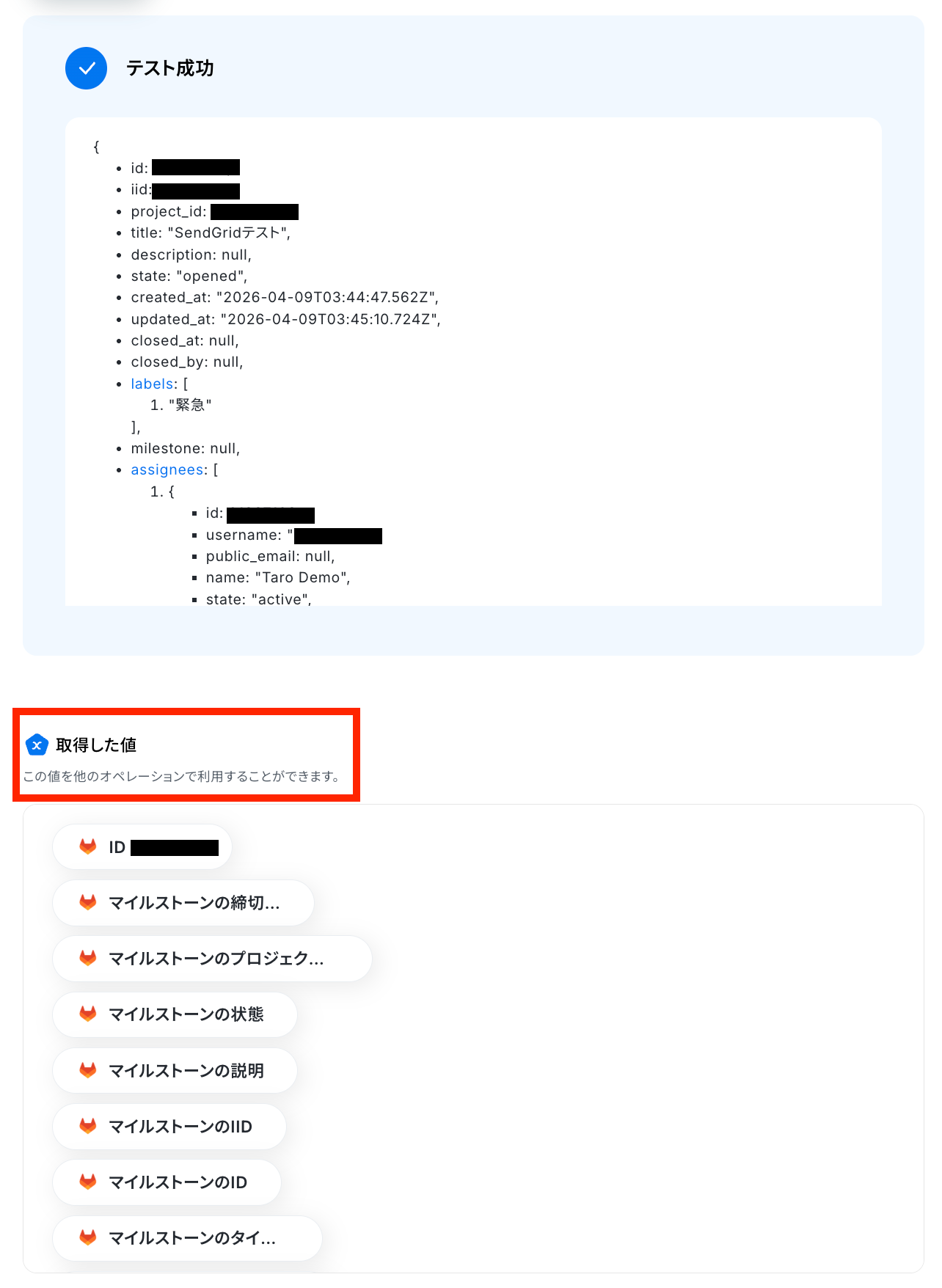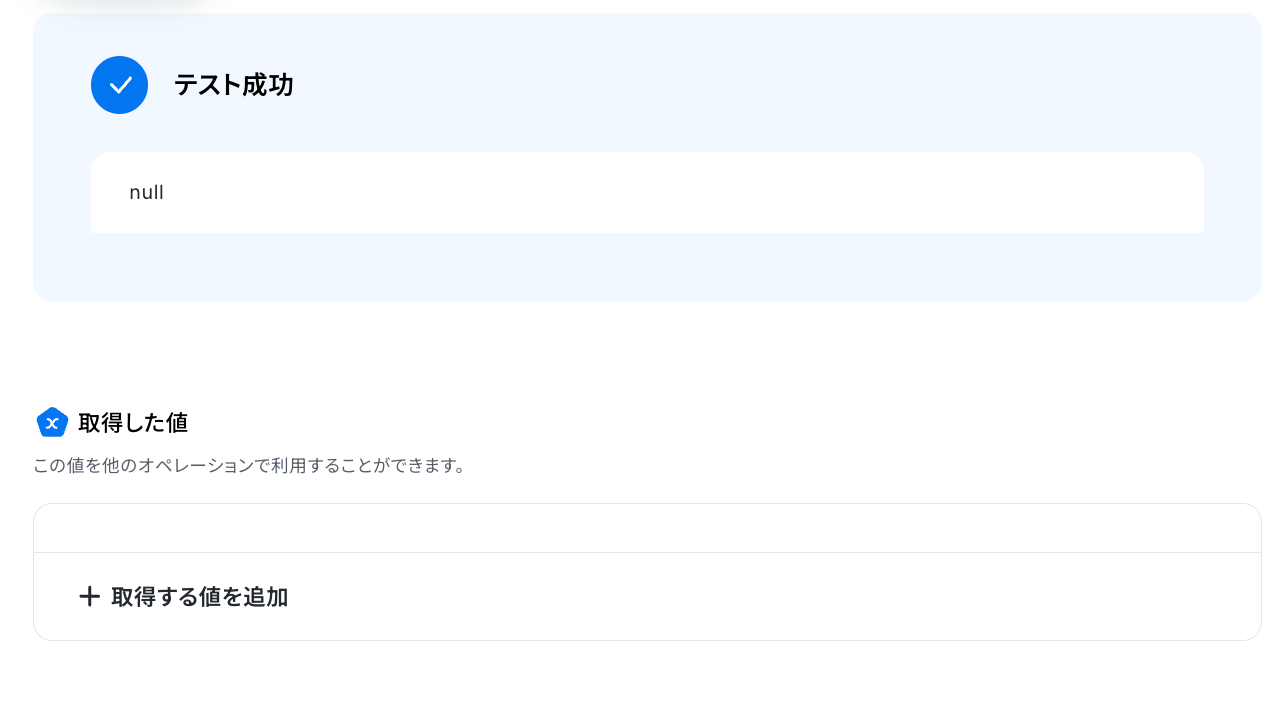 テスト成功で、取得した値 が取得されます。 内容を確認したら、官僚をクリックしましょう。