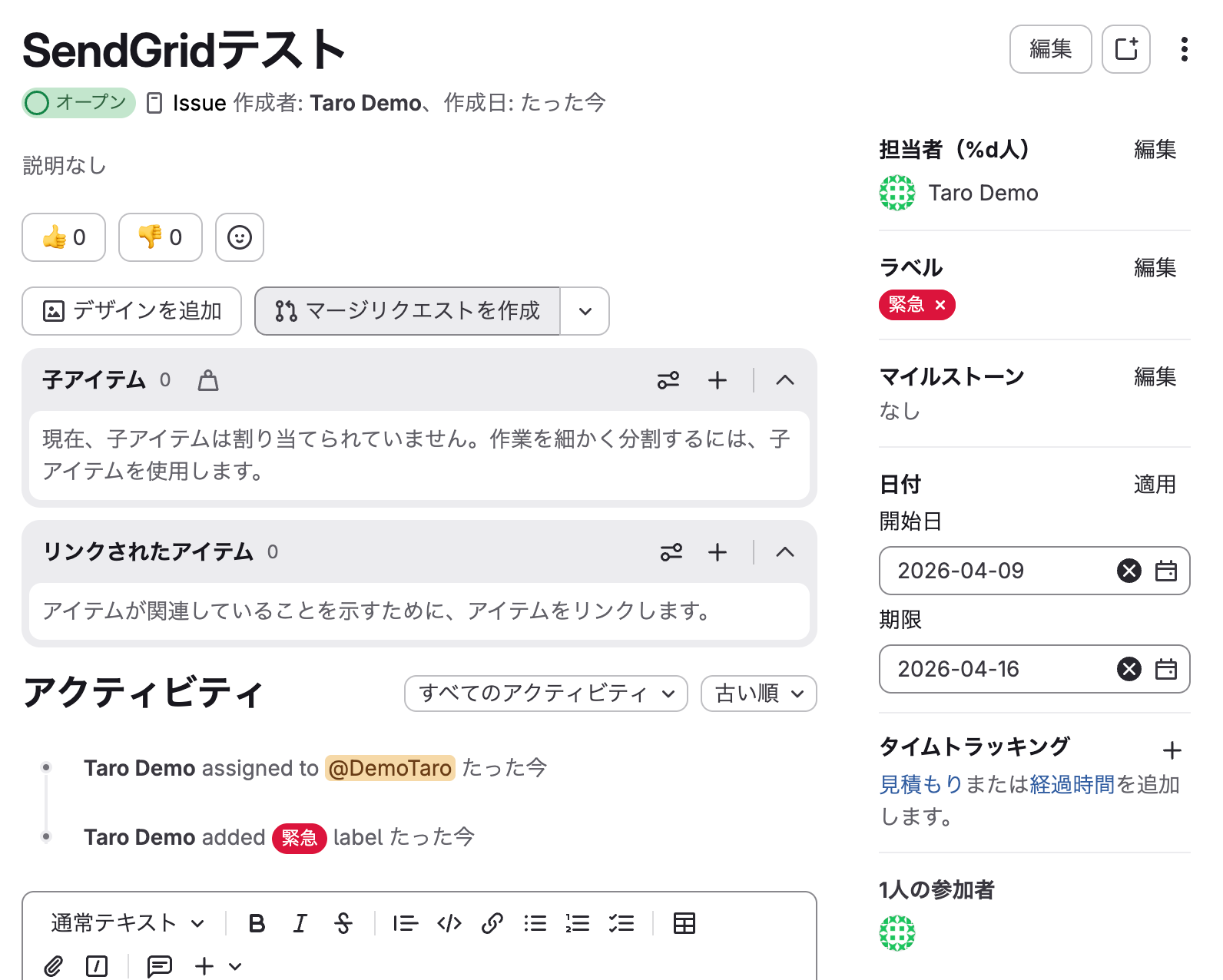 これで、GitLabでイシューが作成されると、自動的にSendGridでメールが送信されるようになります!