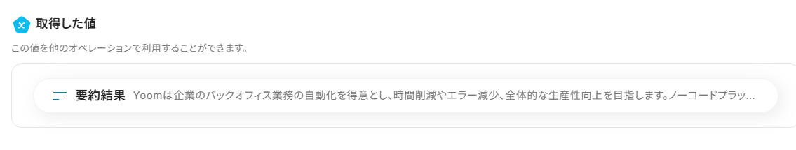 「要約対象のテキスト」は、入力欄をクリックして表示される取得した値から選択してください。