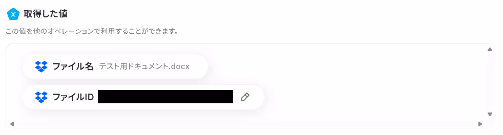 成功すると下記のように「取得した値」欄にDropboxの情報が反映されます。