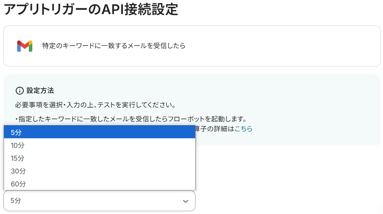 アプリトリガーのAPI接続設定という画面が表示されるので、まずトリガーの起動間隔をプルダウンから選択しましょう。