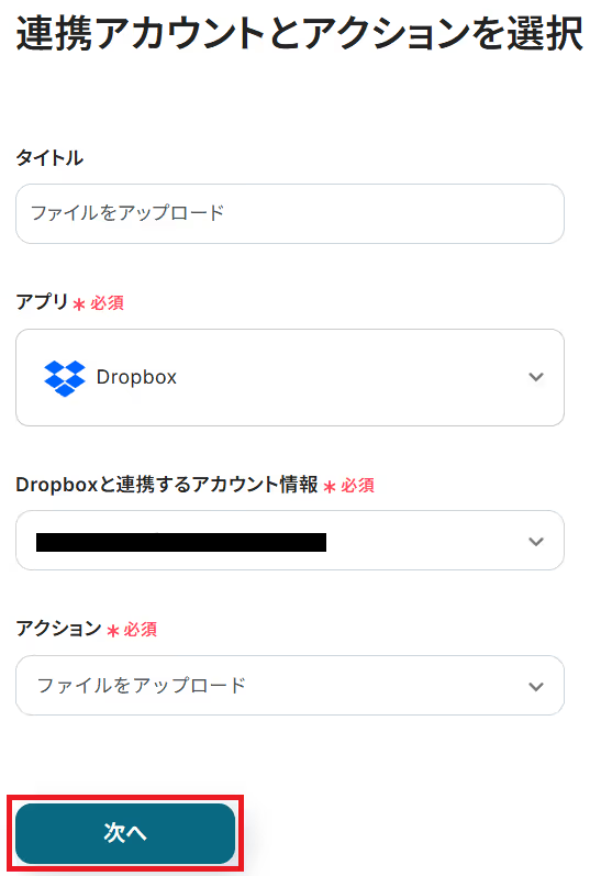 A:Dropboxの「ファイルをアップロード」アクションには、オペレーションごとに300MBの容量上限があります。