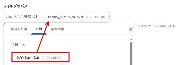 Dropboxの「ファイルをアップロード」アクションで、取得した値だけでなく「日付」タブから下図のように設定することで、任意の日付をファイル名に追加することができます。