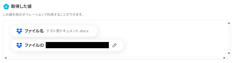 取得した値は、オペレーション設定時の値としてご利用いただくことができ、フローボットを起動する度に、変動した値となります。