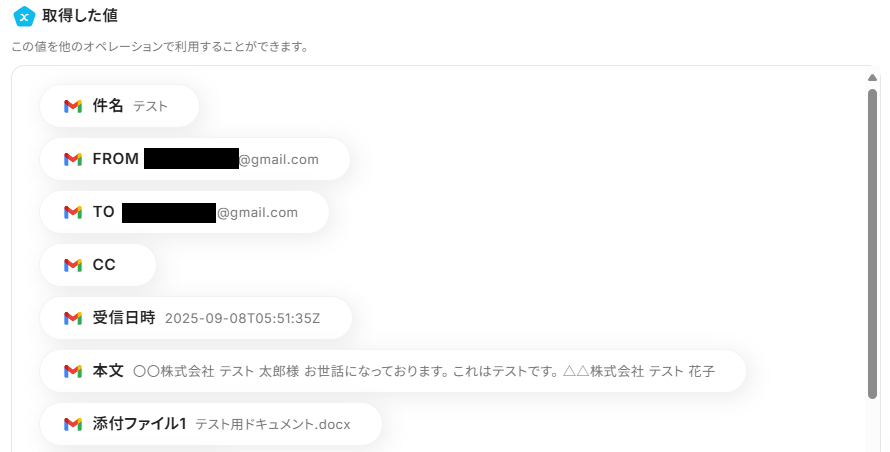 成功すると、下記のように「取得した値」にGmailの情報が反映されているはずです。