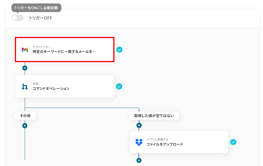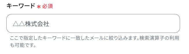 今回は、「△△株式会社」というキーワードが含まれるメールが届いたらトリガーとなるよう設定しました。