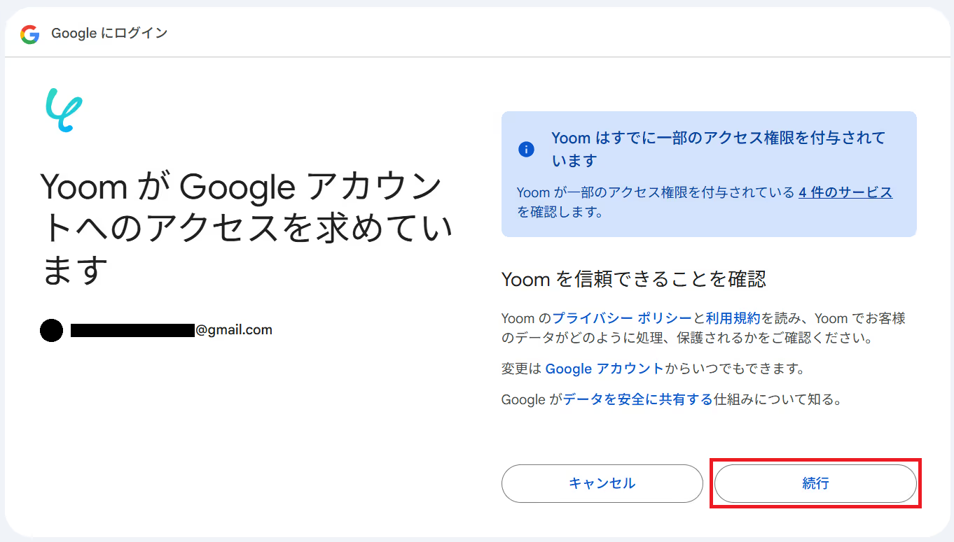 「続行」をクリックするとGmailのマイアプリ連携が完了します。