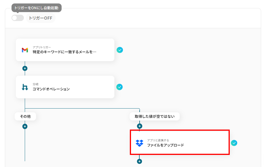 このワークフローを活用すれば、Gmailで特定のラベルが付いたメールを受信した際に、添付ファイルを自動でGoogle Driveにアップロードすることが可能になり、ファイル管理業務を効率化します。