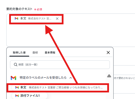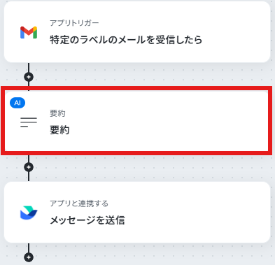 - AI機能の「テキストを要約」では、要約の対象として事前のGmailアクションで取得したメール本文などを設定し、要約の条件も任意の内容で指定してください。