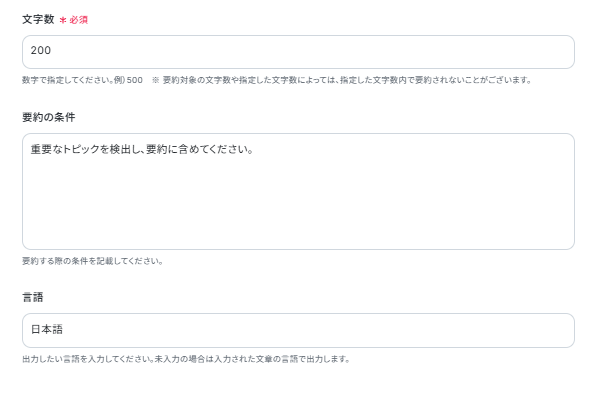「要約」はAIで行っているので、「文字数」を入力して長さを、「要約の条件」に条件を追加していただければトーンを調整できます。