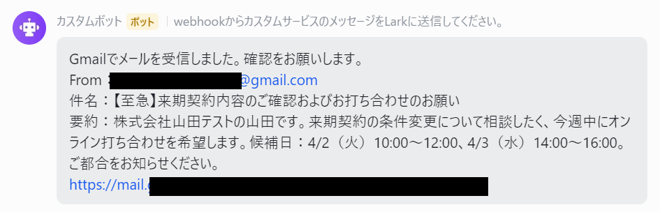 Gmailで特定のメールを受信したら、Larkに要約を通知する