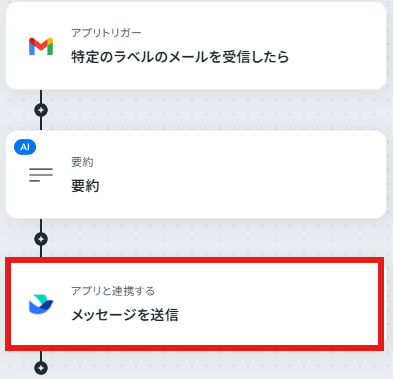 - 最後に、オペレーションでLarkの「メッセージを送信」を設定し、要約内容を指定のチャットに通知します。