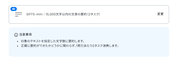 - AI機能でテキストを生成するアクションでは、要約の形式や文字数など、アウトプットしたい内容に応じてプロンプト(AIへの指示)を任意で設定してください。