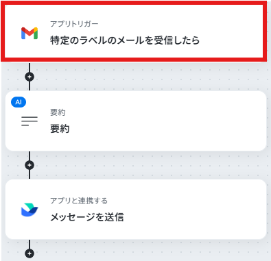 - 次に、トリガーでGmailを選択し、「特定のラベルのメールを受信したら」というアクションを設定します